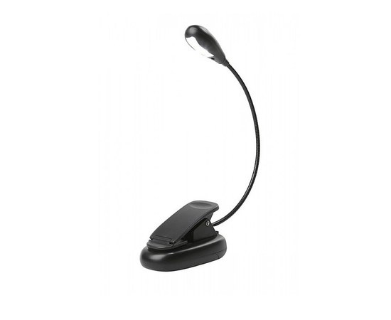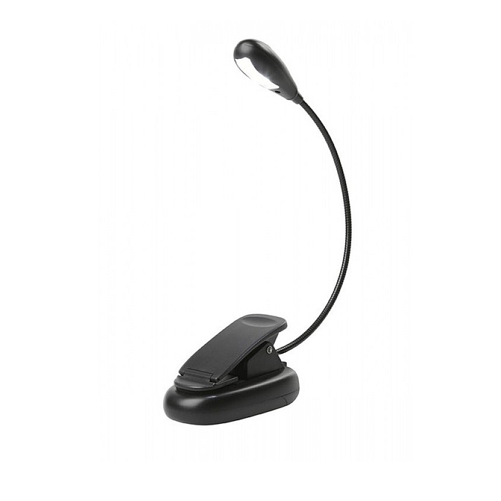 Светодиодная подсветка для пюпитра, мягкий гибкий держатель с клипсой, регулировка интенсивности света каждого из двух светодиодов, USB-кабель и 3 штуки AAA батарейки 1.5 В входят в комплект поставки, чёрный матовый цвет.