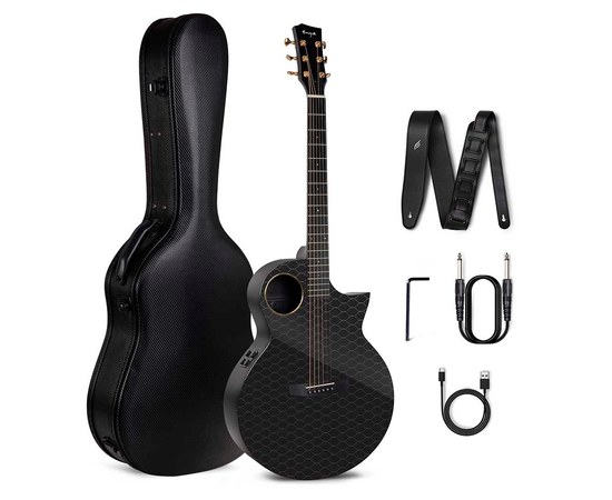 Трансакустическая гитара, размер 4/4 (41"), корпус из углеволокна (карбон), электроника Double-TA-S4, гриф из углеволокна с алюминиевым анкерным стержнем, накладка на гриф и бридж Richlite, 21 лад, струны Elixir 16052, в комплекте: кейс, ремень, ключ, кабель, зарядка
