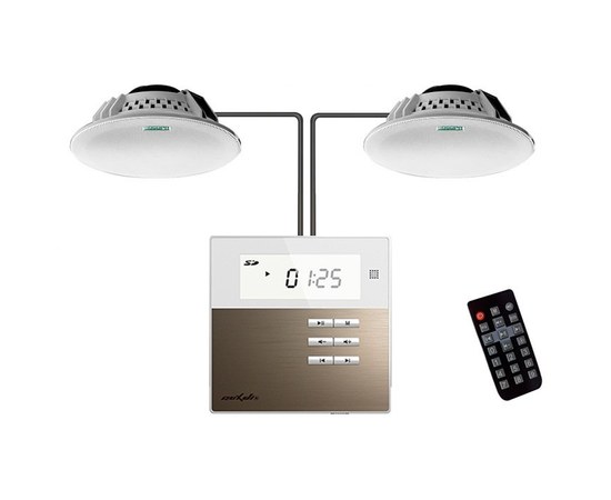 Трансляционный комплект, состоящий из двух потолочных громкоговорителей DSP5011L и компактного усилителя (20Гц-20кГц) с мультимедийным проигрывателем DM835, цвет золотисто-белый.