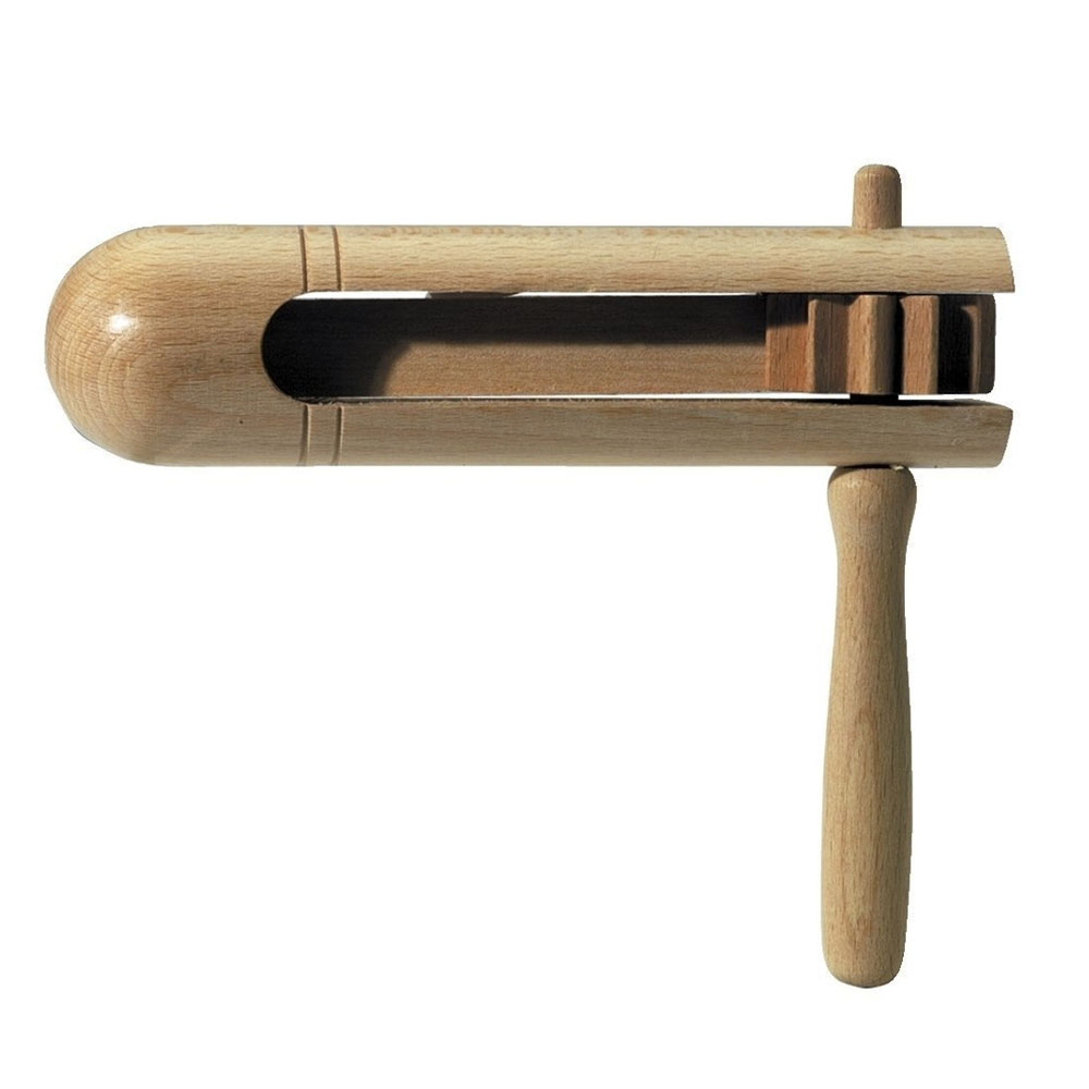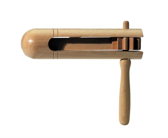 Оркестровая трещотка на ручке вращательного типа, корпус из светлого натурального дерева.
