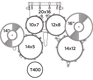 Барабанная установка, серия Comet, корпуса из 9-слойного тополя (7,2 мм), держатель тома TH6215 с регулировкой на 360°, конструкция среза SONIClear™, фурнитура: C250, S250S, P250, H250, T400S; тарелки 14" хай-хэт и 16" крэш, цвет Dark Black.