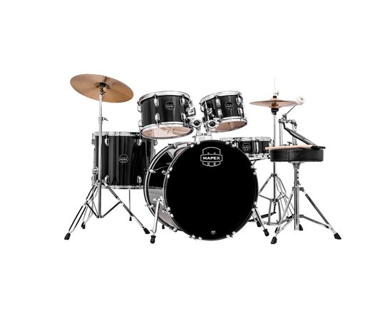 Ударная установка для начинающих, корпуса барабанов изготовлены из 9-слоев липы, штампованные ободы Mapex, упругие вибропоглощающие опоры ножек напольных томов, низкопрофильные утопленные шипы ножек большого барабана с амортизирующими опорами, 8 настроечных винтов малого барабана, яркое резонантное звучание с естественным сустейном.