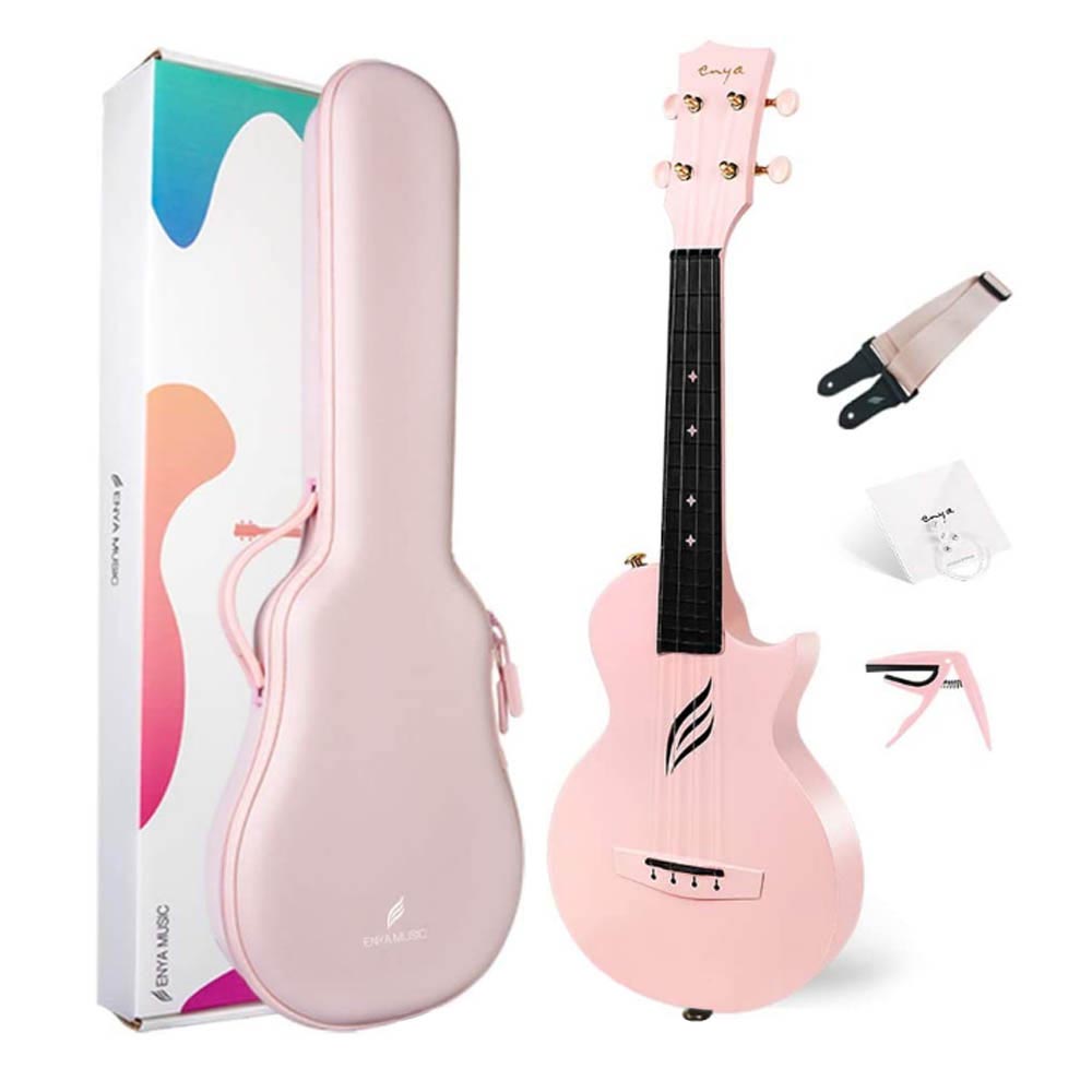 Укулеле размера концерт; корпус, гриф и бридж из углеродного волокна и поликарбоната (карбон); устойчива к любым погодным условиям, колки Gold Opening, струны Enya E6, в комплекте: подарочная коробка, фирменный чехол, набор запасных струн, ремень и каподастр.